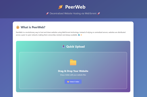 PeerWeb is a revolutionary way to host and share websites using WebTorrent technology. Instead of relying on centralized servers, websites are distributed across a peer-to-peer network, making them censorship-resistant and always available. 🌍✨
