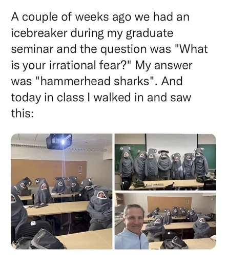 Hey teach, hope you don’t mind I brought my Olympic sized pool and full grown hammerhead shark to class. Couldn’t find a babysitter.