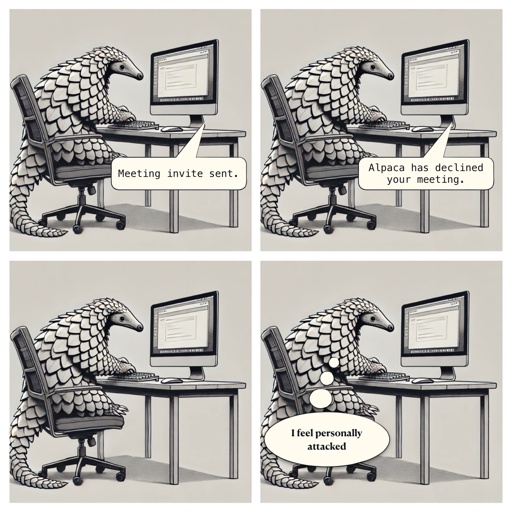 Pangolin had it coming, setting up meetings without looking at coworkers’ calendars. Fuck you, discount armadillo, you’re not more important than me!