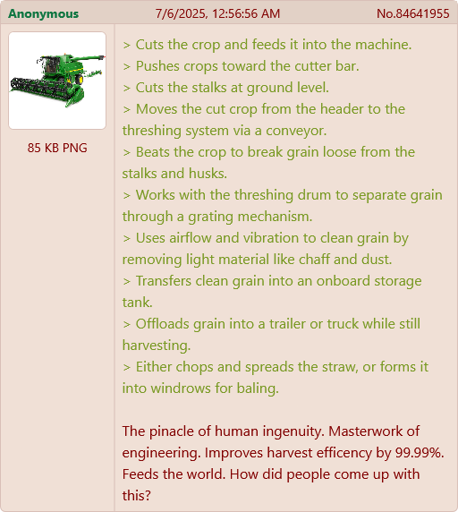 arrow-up1189arrow-down1imageI watched several videos on a Combine Harvester's inner workings and I still don't understand how this thing works.lemmy.mlPharmacokinetics@lemmy.world to > Greentext@lemmy.mlEnglish · 6 months agomessage-square12linkfedilink