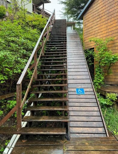 I’d say the ramp is probably for pushing a bike up and down it or something, and the wheelchair sticker is just a joke.